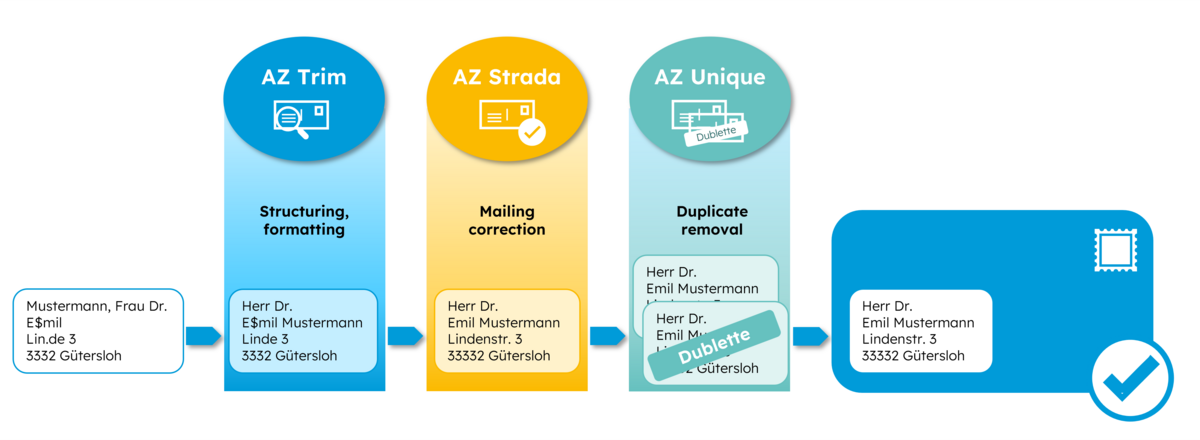 AZ PICK and AZ BICK are integrated directly into the eCommerce platform as an online process and provide you with information on deliverability, etc. in real time, or as a batch process for processing large volumes of addresses.